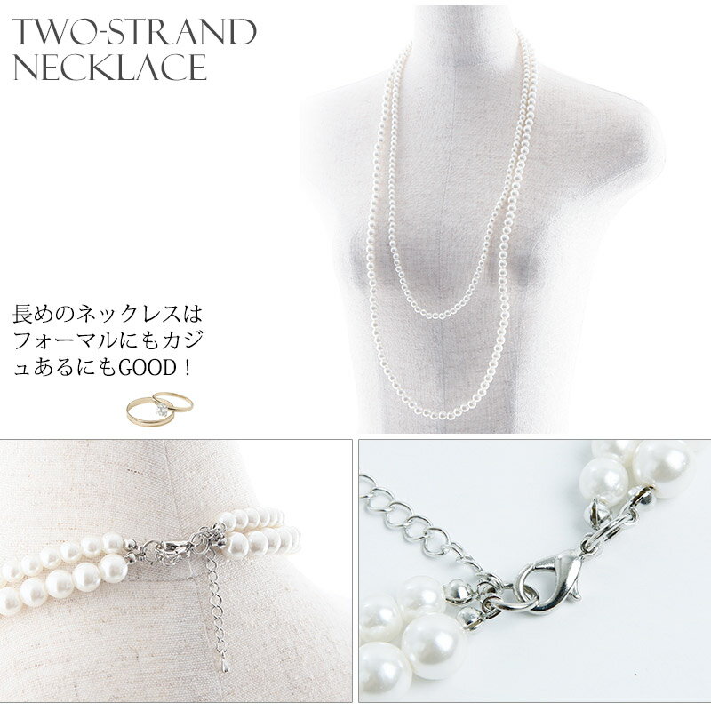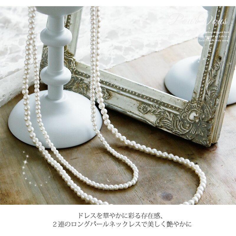 シンプルだからこそどんなコーディネートにも◎ドレスを華やかに彩る存在感、2連のロングパールネックレスで美しく艶やかにコーディネートに柔らかな輝きをプラスさせます。