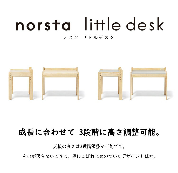 はじめての自分家具 「nosuta」 ノスタ シリーズ 商品概要 商品名 キッズデスク ノスタ リトルデスク サイズ ●約幅62×奥行き40.7×高さ51.2cm ・デスク天板の高さ3段階調整:約46、43、40cm ●本体重量:5kg ●梱包重量:6kg 素材 パイン材 生産国 インドネシア 注意点 ※木製品につき、サイズや重量は誤差が生じることがあります。