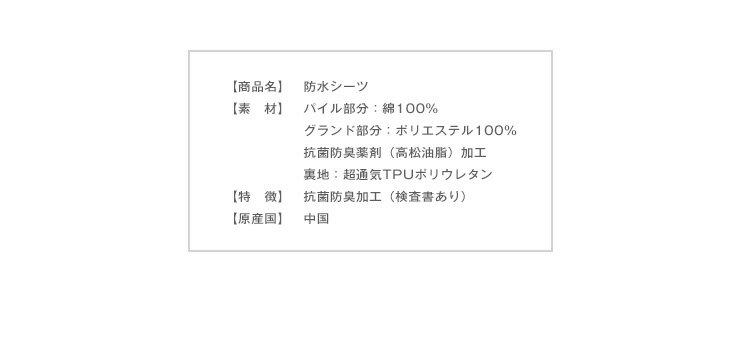 【商品名】防水シーツ BOXシーツタイプ【商品サイズ】140×200×30cm【素材】パイル部分:綿100%グランド部分:ポリエステル100%抗菌防臭薬剤(高松油脂)加工裏地:超通気TPUポリウレタン【特徴】抗菌防臭加工(検査書あり)【原産国】中国【送料について】北海道、沖縄、離島は別途送料を頂きます。