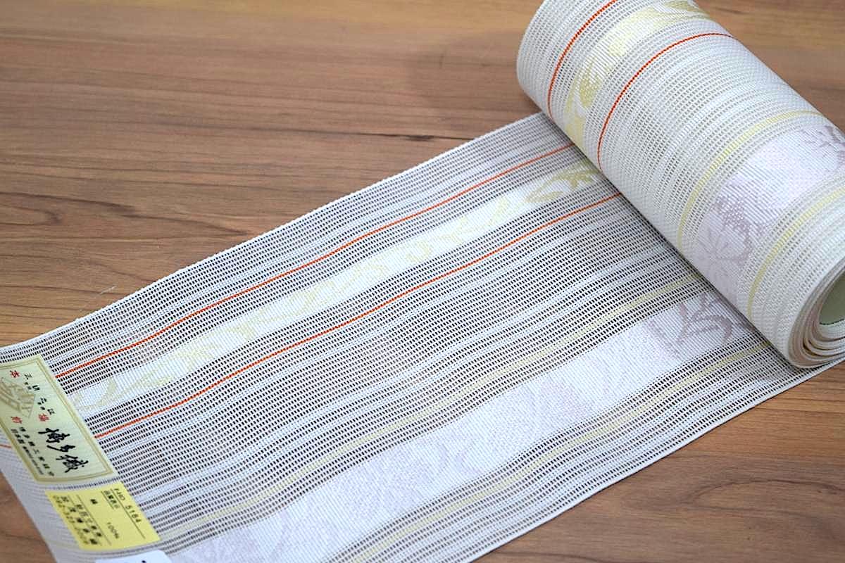 本場筑前博多織の半幅帯、単衣四寸帯(紗四寸帯)です。
