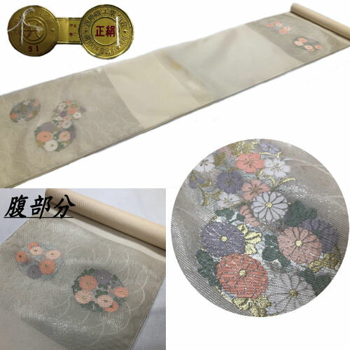 【訳あり特価品】 九寸名古屋帯 絽 正絹 西陣織 ベージュ地 未仕立て品 名古屋帯 夏帯 おしゃれ カジュアル お稽古 習い事 着物 お茶席 新品 夏物 小紋 浴衣 夏紬 夏着物 なごや帯 国定織物 菊 撫子 紅葉 少々難あり