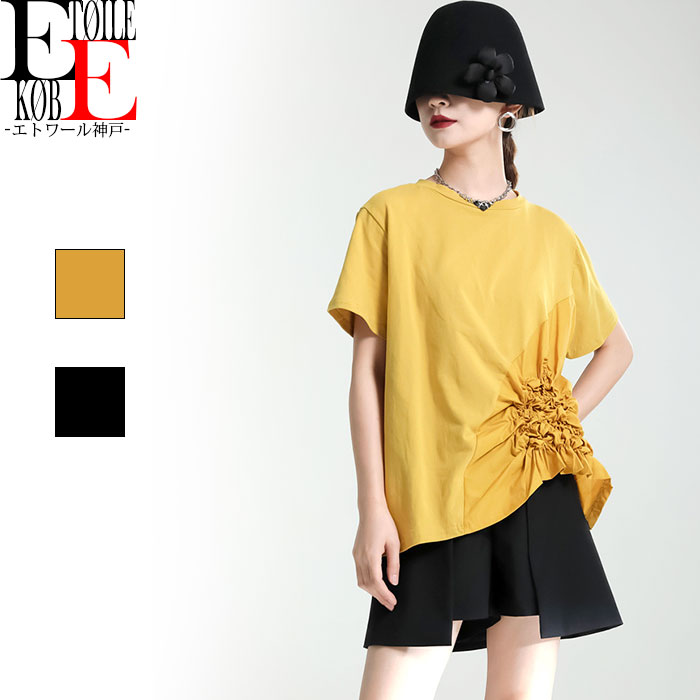 トップス 半袖 ショート カットソー おしゃれ きれいめ カジュアル 細見え 大きめ 大きいサイズ モード モード系 ダンス ステージ 舞台 バンド バンギャ ビジュアル系 衣装 ファッション 韓国 トレンド レディース 服 服装 黒 ブラック 黄色 イエロー 春 夏 春夏 春夏服