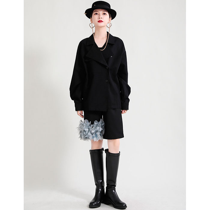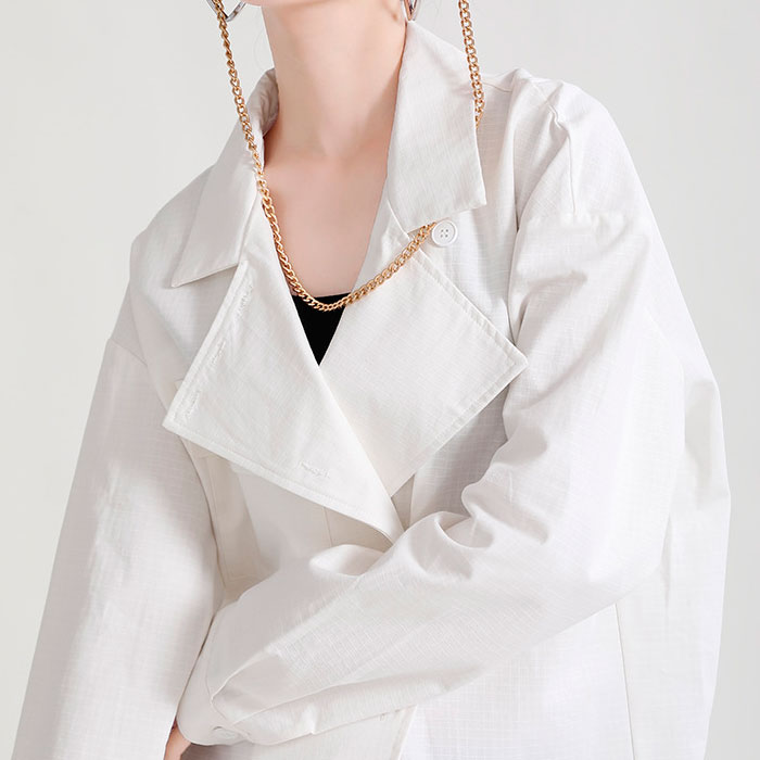 大きめ襟にアウタージャケットの様な前ボタンが非常におしゃれにエレガントな個性を演出します。