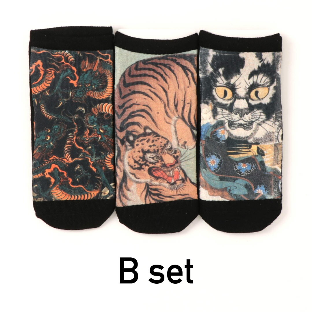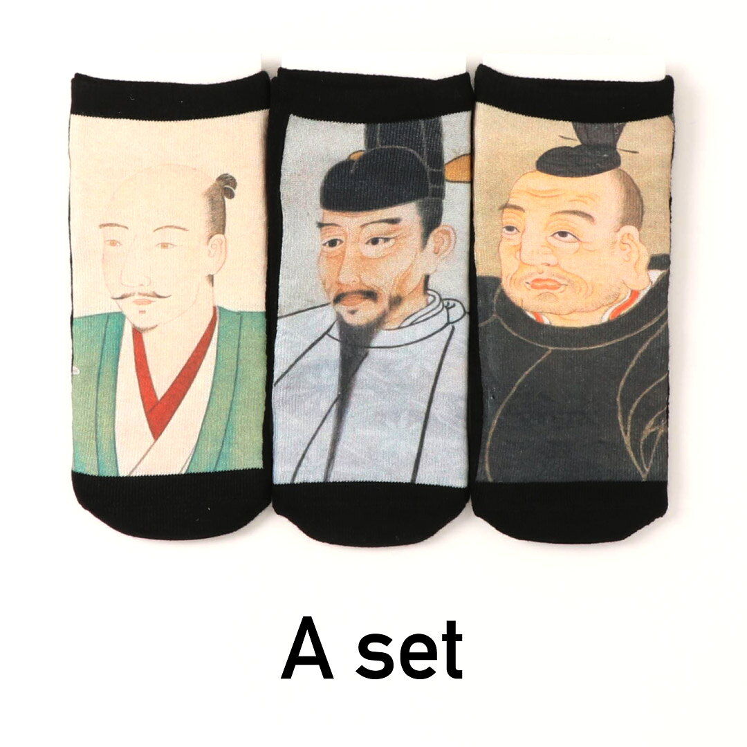 スニーカー丈ソックス3足セット/和柄転写/メンズ 25-27cm/和極-WAGOMI- Aセット 織田信長 豊臣秀吉 徳川家康 Bセット 禽獣虫魚図会 麹町十三丁目福寿院興行 猫石の由来 Cセット 相州梅沢庄 黒船 玉川堤の桜 Dセット 全盛美人揃 梅ケ谷の土俵入 加賀見山再岩藤