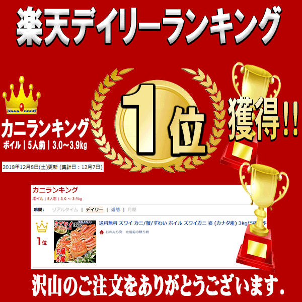 名称 冷凍ボイルズワイガニ 原材料 ズワイガニ(カナダ産) 内容量 3kg(5尾か6尾入、不揃い)※解凍後は約1〜2割目減りします。