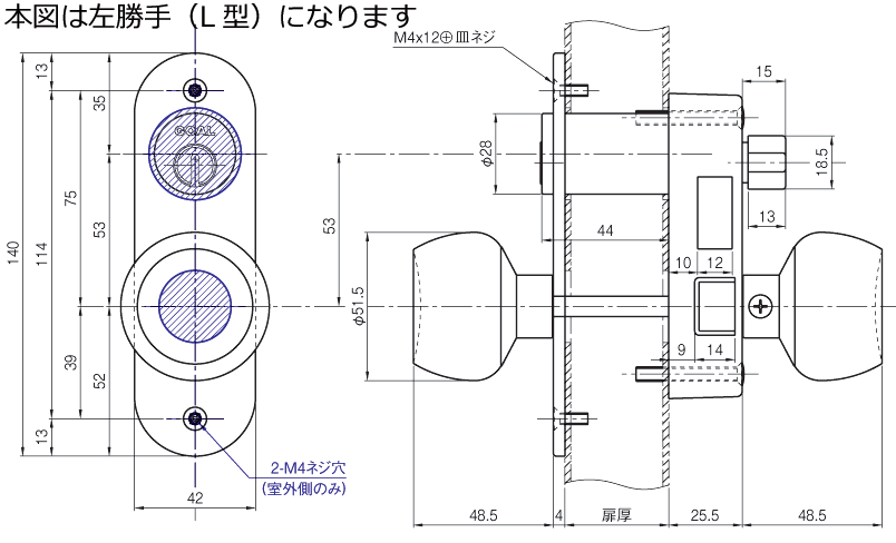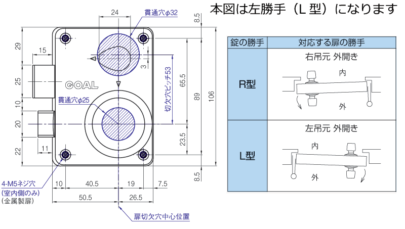 メーカー名 GOAL(ゴール) 型式 P-4350R(右勝手) P-4350L(左勝手) 色 シルバー 対応扉厚 36~40mm フロント記号 なし キー本数 メーカー純正キー3本 注意事項 右勝手と左勝手があります。